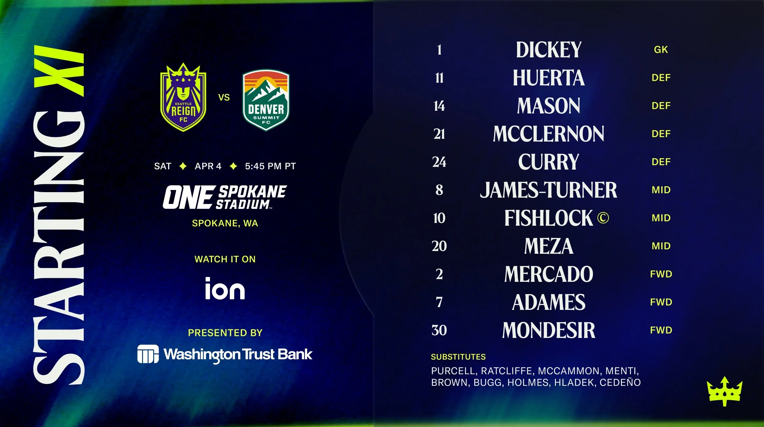 Seattle Reign FC Head Coach Laura Harvey fields her fifth unique lineup of the 2026 season as the Reign take on NWSL debutants Denver Summit FC at ONE Spokane Stadium in Spokane, Washington. Fans can tune in to the match on ION for kickoff at 5:45 p.m. PT.