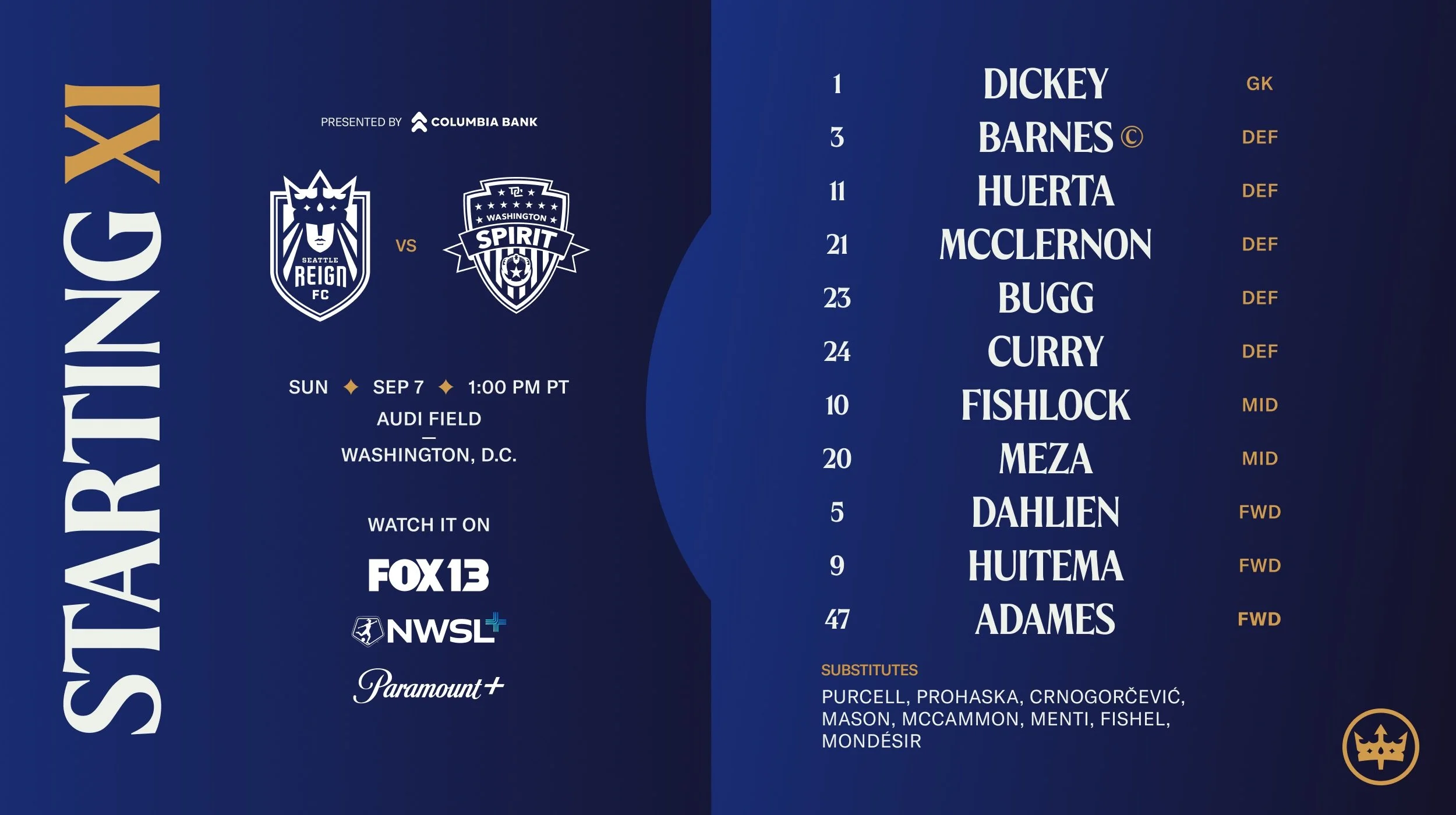 Seattle Reign FC Head Coach Laura Harvey fields her 18th unique lineup of the season as Reign FC takes on the Washington Spirit at Audi Field in Washington, D.C. Tune in to the match at 1:00 p.m. PT on FOX 13+ in the Seattle area, or on NWSL+ or Paramount+.